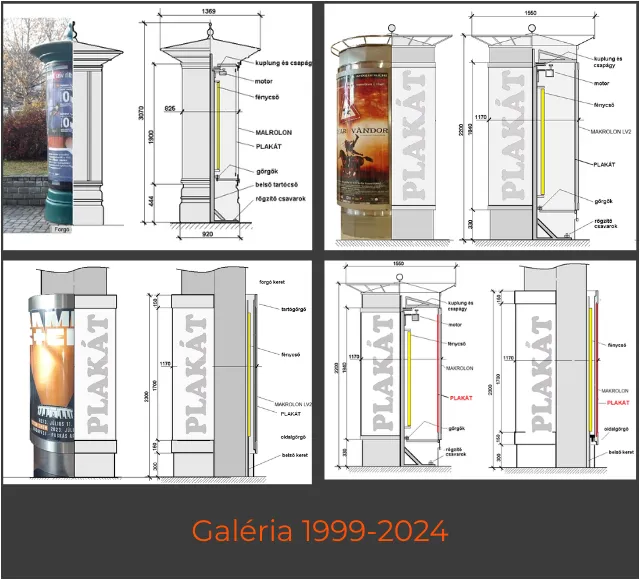 Oszlop körül forgó acél váz, polikarbonát felület, rozsdamentes burkolat, belső világítás.